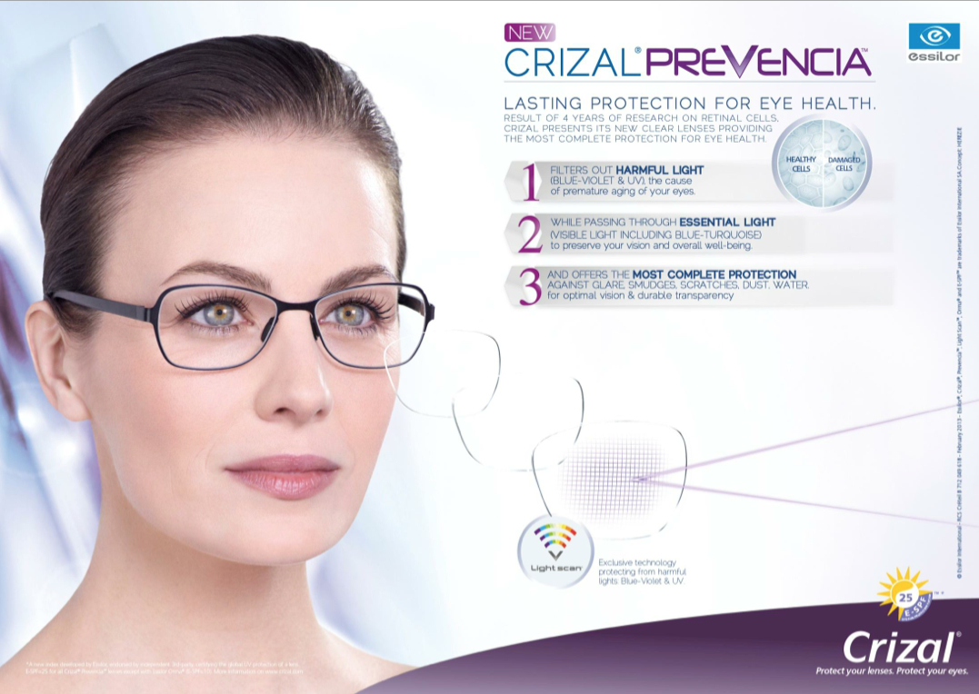 Essilor CRIZAL PREVENCIA treatment lens ที่เลือกตัดเฉพาะคลื่นเเสงสีน้ำเงินในส่วนที่เป็นอันตรายออกไป เหมาะกับการใส่เพื่อปกป้องดวงตาจากคลื่นเเสงที่เป็นอันตราย