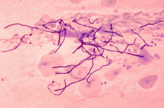 รูปที่ 4 เมื่อนำก้อนรามาย้อมแล้วส่องกล้องจุลทรรศน์จะพบเชื้อราเป็นสายพร้อมกับสปอร์ที่กำลังแบ่งตัว
