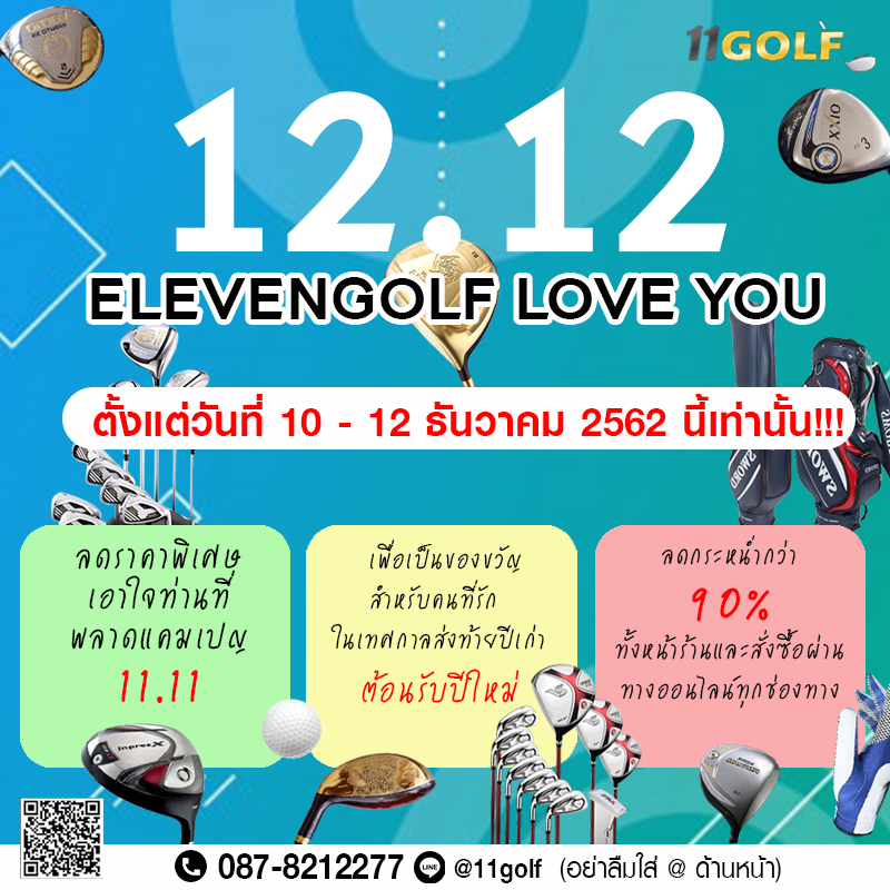 12.12 ELEVENGOLF LOVE YOU - ลดราคาพิเศษ เอาใจท่านที่พลาดแคมเปญ 11.11 - เพื่อเป็นของขวัญสำหรับคนที่รัก ในเทศกาลส่งท้ายปีเก่า ต้อนรับปีใหม่ - ลดกระหน่ำกว่า 90% หน้าร้าน ทุกสาขา - สั่งซื้อผ่านทางออนไลน์ ทุกช่องทาง ตั้งแต่วันที่ 10 - 12 ธันวาคม 2562 ----------------------------------------------------------------- ติดตามความเคลื่อนไหวได้ตลอดทั้งวัน ได้ที่ • YouTube : https://www.youtube.com/ELEVENGOLF • TEL : 0878212277 • LINE : @11golf (อย่าลืมใส่ @ ด้านหน้านะครับ) หรือแอดไลน์โดยการค...
