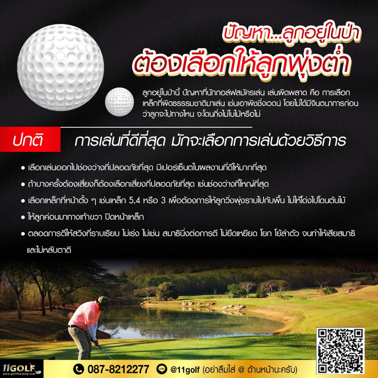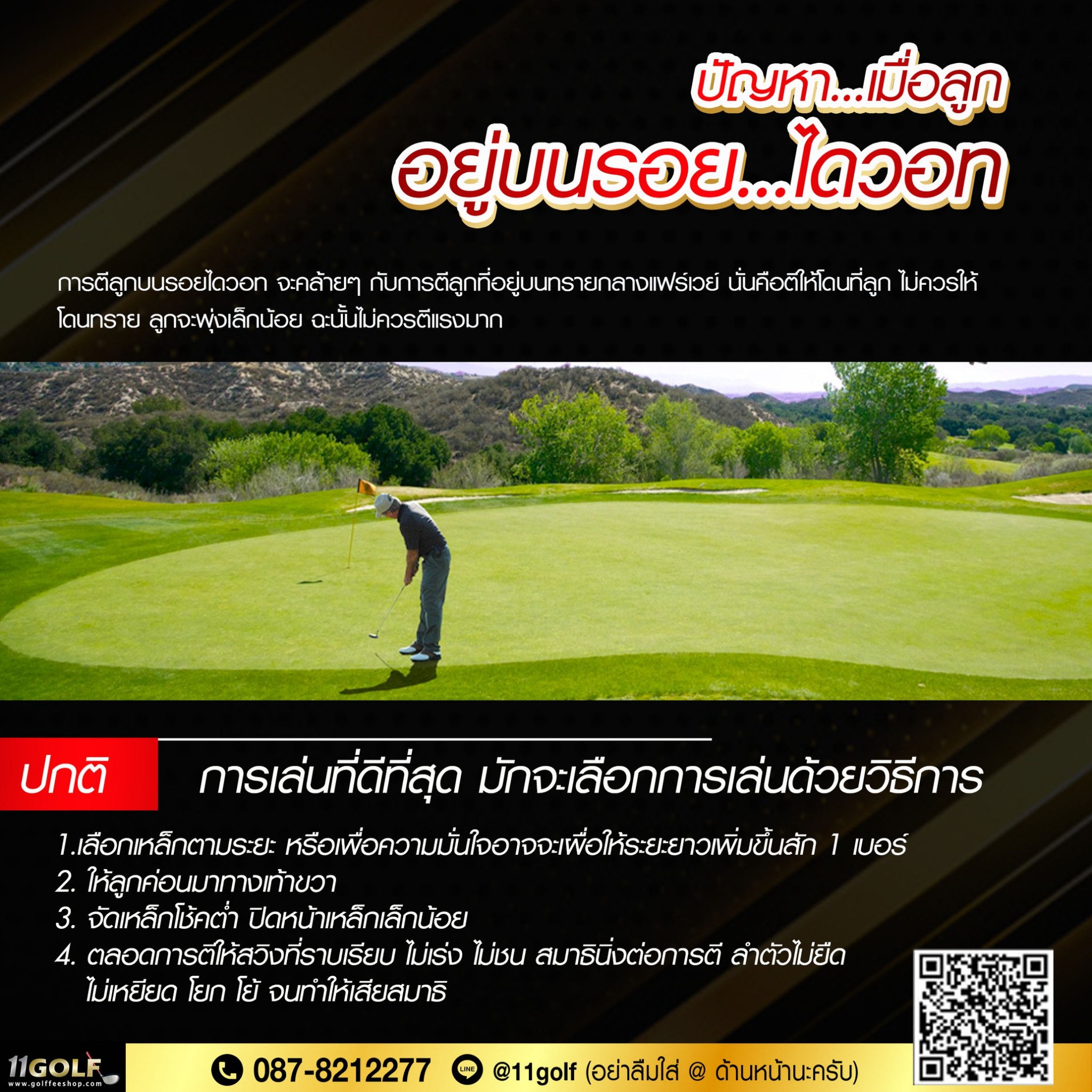 ปัญหา...เมื่อออกรอบแล้วตีไม่ค่อยโดนลูก การที่จะตีให้โดนดีๆ แต่ละครั้งนั้น นักกอล์ฟจะต้องได้รับการผึกและ มีความเข้าใจในเบื้องต้นเป็นเบสิกก่อนว่า การตีกอล์ฟนั้น ประกอบด้วยสองแรงที่จะต้องกระทำได้แก่ . ก. แรงฟันลงที่พื้น (แรง a) . ข. แรงเหวี่ยงไปข้างหน้า (แรง a) ซึ่งถ้าออกแรง ฟันอย่างเตียว ก็จะป็นอาการทุบพื้นง่าย หรือ ถ้าเป็นการเหวี่ยงอย่างเดียวก็จะเป็นอาการตี ท็อปห้วลูก (ลูกวิ่งไล่ตั้กะแตน) . ค. การตีที่ถูกจะต้อง จต้องรวมแรงสองแรง เข้าด้วยกันคือ atb = เป็นแรง c นั่นคือ ต้องเป็นแรงฟันและแรงเหวี่ยงไป...