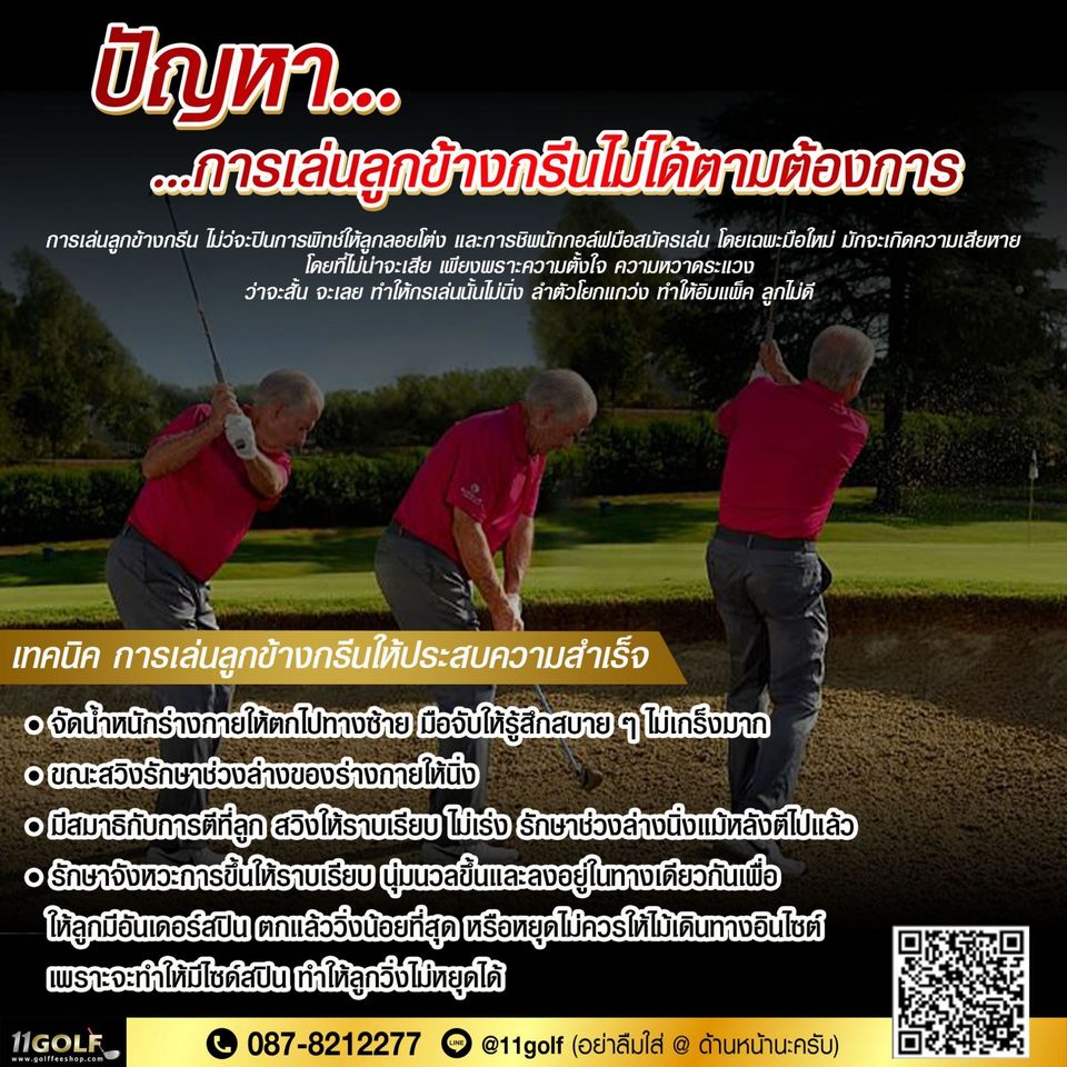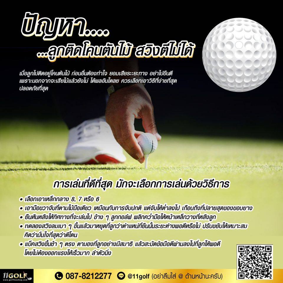 ปัญหา..ลูกติดโคนต้นไม้ สวิงตีไม่ได้ เมื่อลูกไปติดอยู่โคนต้นไม้ ก่อนอื่นต้องทำใจ ยอมเสียระยะทางอย่าไปขืนตี เพราะนอกจากจะเสียไม้ แล้วยังไม่ได้ผลอันใดเลย ควรเลือกเอาวิธีที่ง่ายที่สุด ปลอดภัยที่สุด การเล่นที่ดีที่สุด มักจะเลือกการเล่นด้วยวิธีการ เลือกเอาเหล็กกลาง 8,7 หรือ 6 เอามือขวาจับที่ตามไม้มือเดียว เหมือนกับการจับปกติ แต่จับให้ต่ำลงไป เกือบถึงที่ปลายสุดของขอบยาง ยืนหันหลังให้ทิศทางที่จะเล่นไป ข้างๆ ลูกกอล์ฟ พลิกคว่ำมือให้หน้าเหล็กวางที่หลังลูก ทดลองสวิงลมเบาๆ ขึ้นแล้วมาหยุดที่ลูกว่าตำแหน่ง ที่ย...