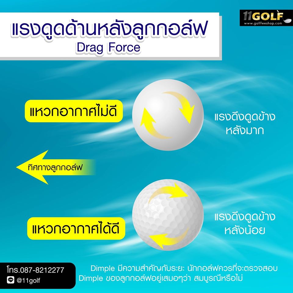 แรงดูดด้านหลังลูกกอล์ฟ Drag Force การเคลื่อนที่ของลูกกอล์ฟกลางอากาศ ยามลอยอยู่บนอากาศซึ่งมีความสัมพันธ์กับแรง (Force) ตามหลักการทางฟิสิกส์ 2 ชนิด โดยทันทีที่หน้าไม้กระทบเข้ากับลูกบอล หลังการไดรฟ์จะทำให้เกิด แบ็กสปิน (Back Spin) หรือลูกหมุนทวนเข็มนาฬิกา ตรงข้ามกับทิศทาง ที่พุ่งไปข้างหน้าทำให้เกิดแรงยก (Lift Force) โดยแรงชนิดนี้จะดันลูกในแนวตั้งจากล่างขึ้นบน แบบเดียวกับแรงที่เครื่องบินใช้ในการลอยตัว ส่วนแรงอีกชนิดคือ แรงต้าน (Drag Force) เป็นแรงอันเกิดขึ้นจากการที่อากาศปะทะสวนทาง กับลูกตั้งแต่เริ่...