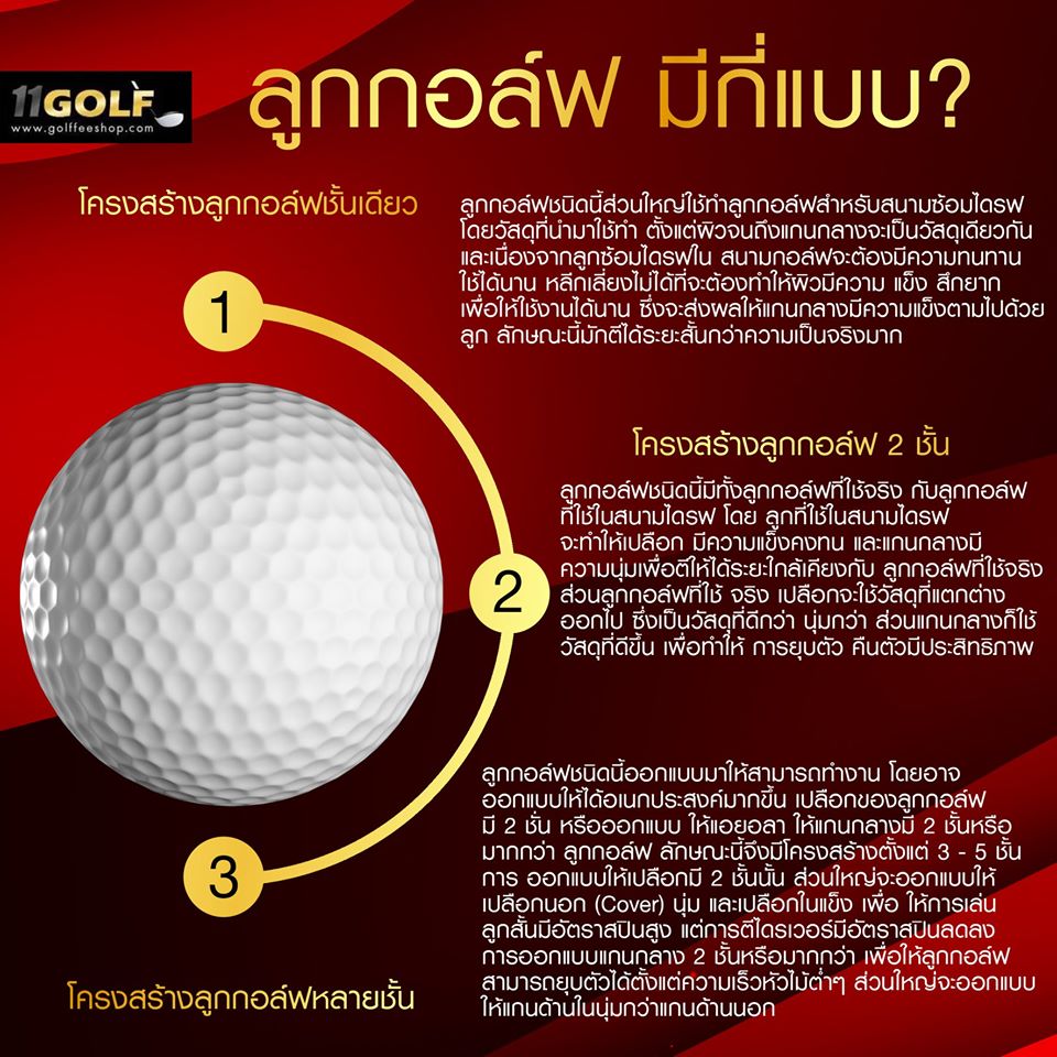 ลูกกอล์ฟ มีกี่แบบ ?? ต่างกันอย่างไร โครงสร้างลูกกอล์ฟชั้นเดียว คือ ลูกกอล์ฟชนิดส่วนใหญ่ใช้ท่าลูกกอล์ฟสำหรับสนามซ้อมไดรฟ์ โดยวัสดุที่นำมาใช้ท่า ตั้งแต่ผิวจนถึงแกนกลางจะเป็นวัสดุเดียวกันและเนื่องจากลูกซ้อมไดรฟ์ในสนามกอล์ฟจะต้องมีความทนทานใช้ได้นาน หลีกเลี่ยงไม่ได้ที่จะต้องทำให้ผิวมีความ แข็ง สึกยาก เพื่อให้ใช้งานได้นาน ซึ่งจะส่งผลให้แกนกลางมีความแข็งตามไปด้วยลูก ลักษณะนี้มักตี ได้ระยะสั้นกว่าความเป็นจริงมาก โครงสร้างลูกกอล์ฟ 2 ชั้น คือ ลูกกอล์ฟชนิดนี้มีทั้งลูกกอล์ฟที่ใช้จริง กับลูกกอล์ฟที่ใช้ในสนา...