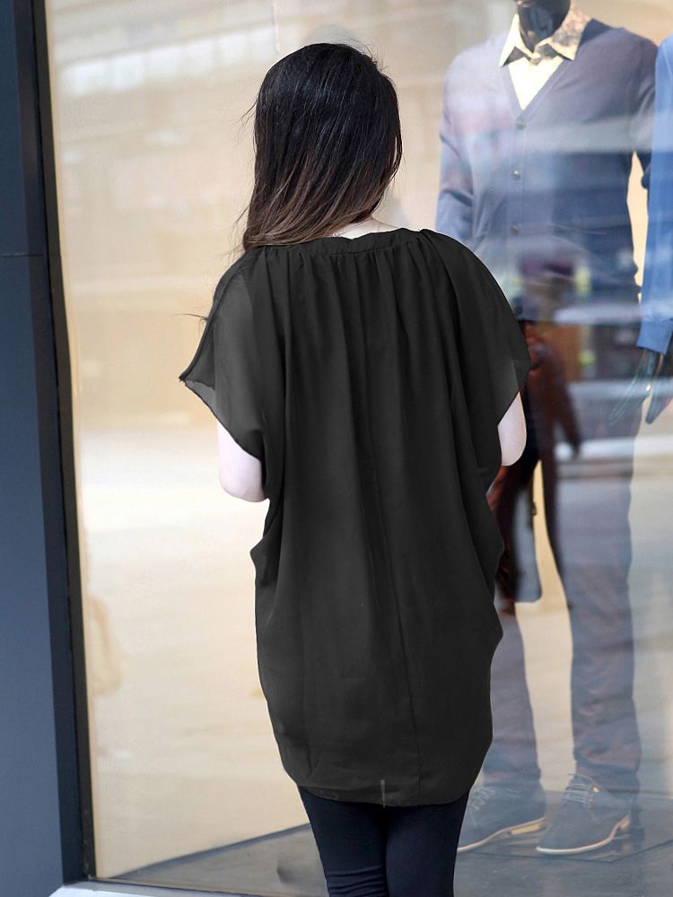 แขนสั้น คอวีเล็กน้อยจับจีบน่ารัก ชุดเป็นทรงปล่อย ห่อชายเก๋
