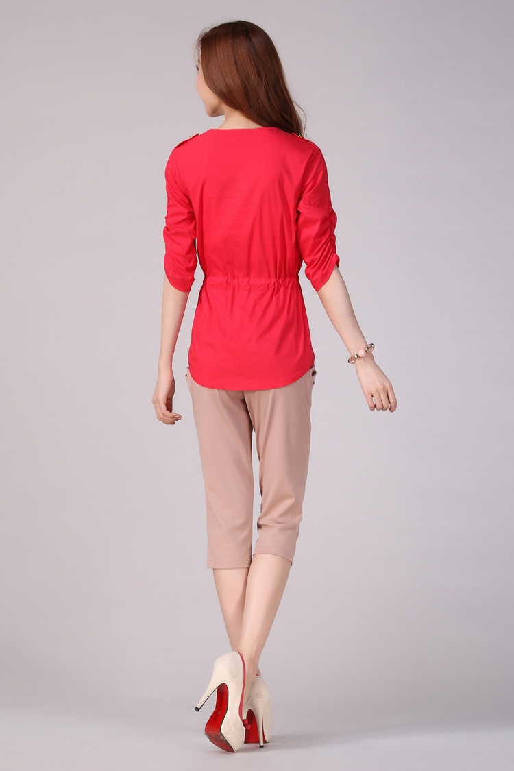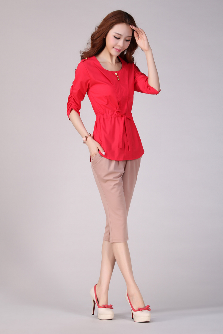 ปลายแขนคอกลมแต่งด้วยกระดุม เอวรูดผูกโบว์น่า