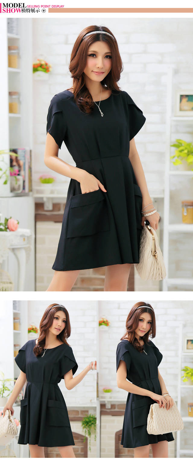 ไซด์ป้ายทับเก๋ไก๋คอกลมช่วงเอวจับจีบ มีกระเป๋าสองข้างน่า