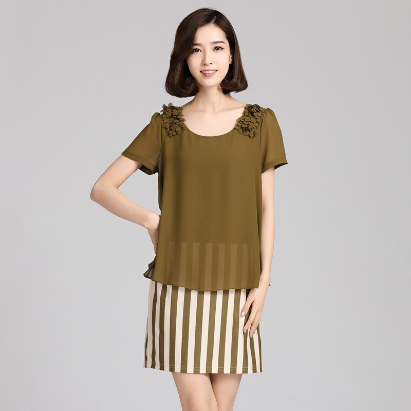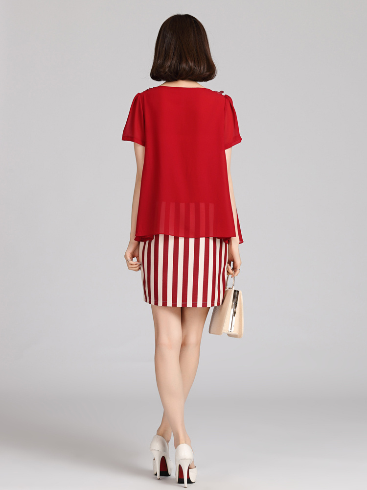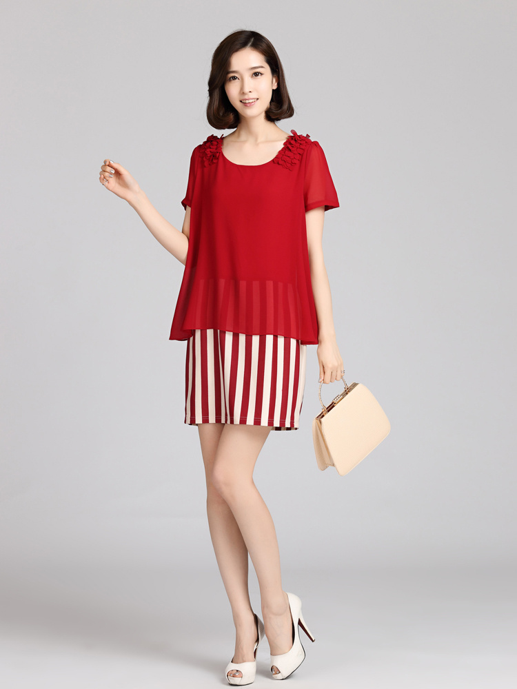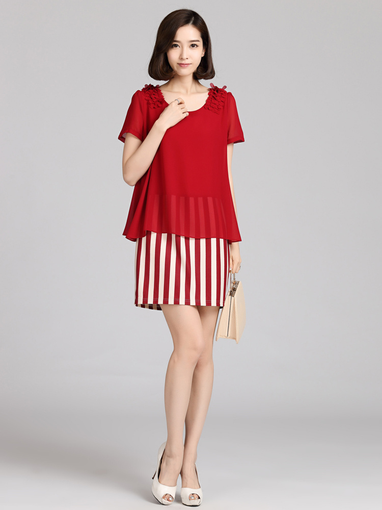 ช่วงตัวเสื้อผ้าชีฟองสีพื้น มีซับใน ช่วงกระโปรงลายทางผ้า