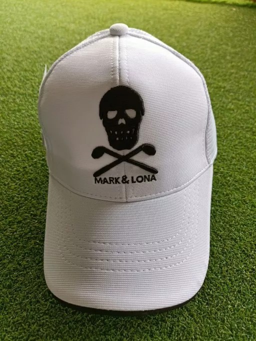 หมวกกอล์ฟเต็มใบ MARK & LONA สไตล์ปีกหมวกแบบโค้ง ช่วยเพิ่มการปกป้องแสงแดด เนื้อน้ำหนักเบาระบายอากาศและเหงื่อได้ดี แห้งไว สายรัดด้านหลังปรับได้ช่วยให้สวมใส่กระชับพอดี แต่งโลโก้แบรนด์ ลายกะโหลก ที่ด้านหน้า ป้องกันแสงแดด ตาข่ายระบายอากาศ ถ่ายเทอากาศสูงสุ