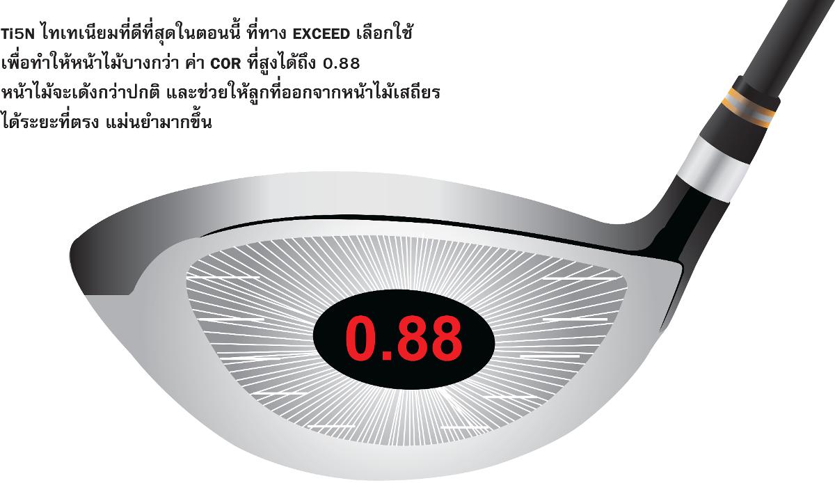 NEW DRIVER EXCEED GEN3 หน้าไม้ วัสดุ TI5N ไทเทเนียมที่ดีที่สุดในตอนนี้ ที่ทาง EXCEED GEN3 เลือกใช้ เพื่อทำให้หน้าไม้บางกว่า ค่า COR ที่สูงได้ถึง 0.88 หน้าไม้จะเด้งกว่าปกติ และช่วยให้ลูกที่ออกจากหน้าไม้เสถียร ได้ระยะที่ตรง แม่นยำมากขึ้น
