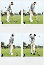 2.แก้ไขท่าสวิง ยืนโดยให้เท้าทั้งสองข้างอยู่ตรงกลางแกนพวงมาลัย และให้ไม้กอล์ฟขนานกับแกนพวงมาลัย