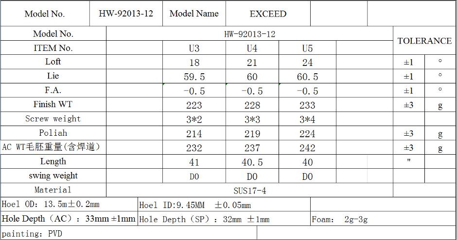 HYBRID EXCEED GOLD หัวไม้ที่ตีง่ายที่สุด เหมาะสำหรับนักกอล์ฟที่ตีเหล็กยาวไม่ได้ระยะ U3 18 องศา จะได้ระยะประมาณ 190-200 หลา U4 21 องศา จะได้ระยะประมาณ 180-190 หลา U5 24 องศา จะได้ระยะประมาณ 170-180 หลา หัวไม้ไฮบริดรุ่นใหม่ล่าสุดของ HYBRID EXCEED GOLD