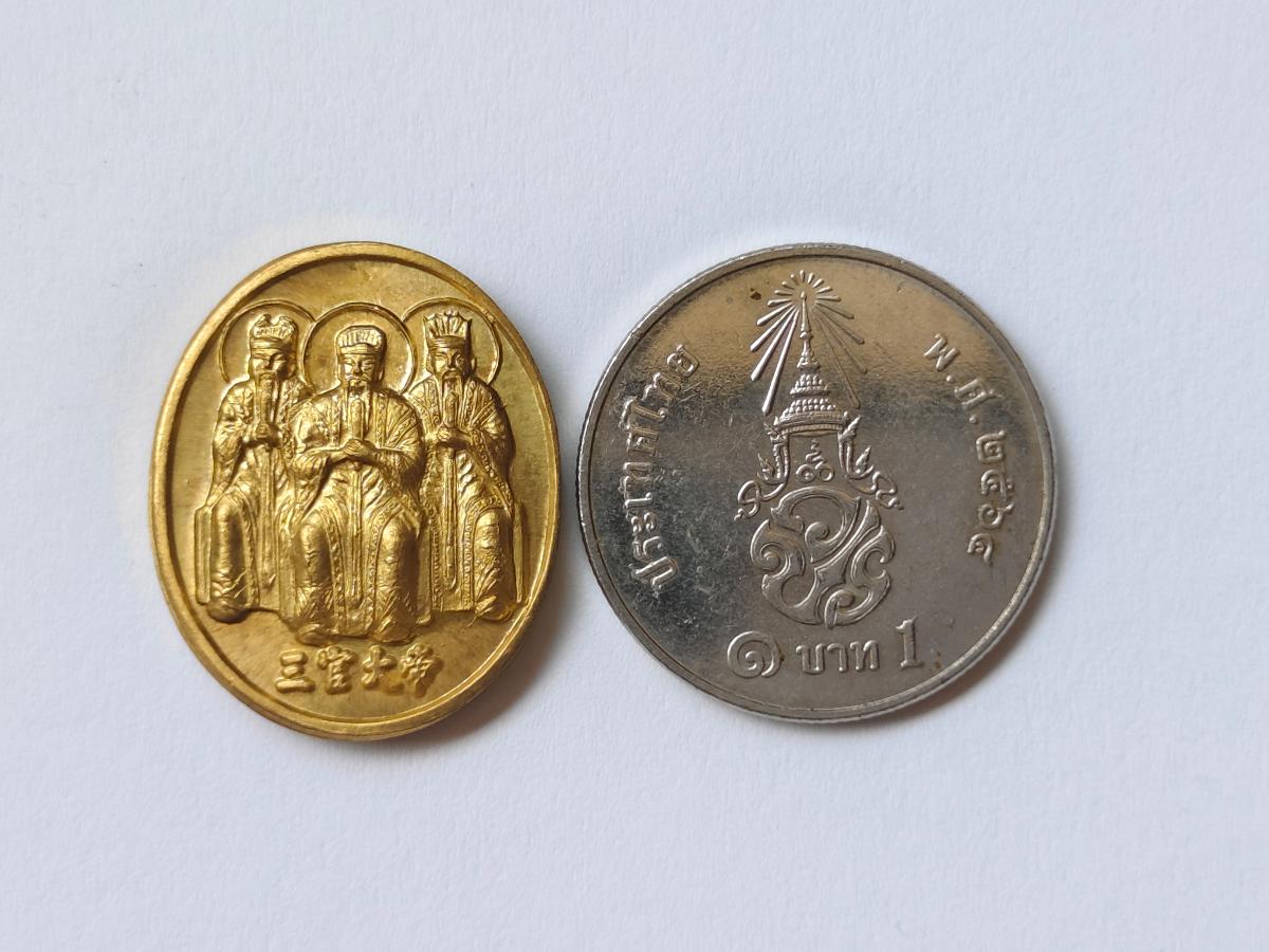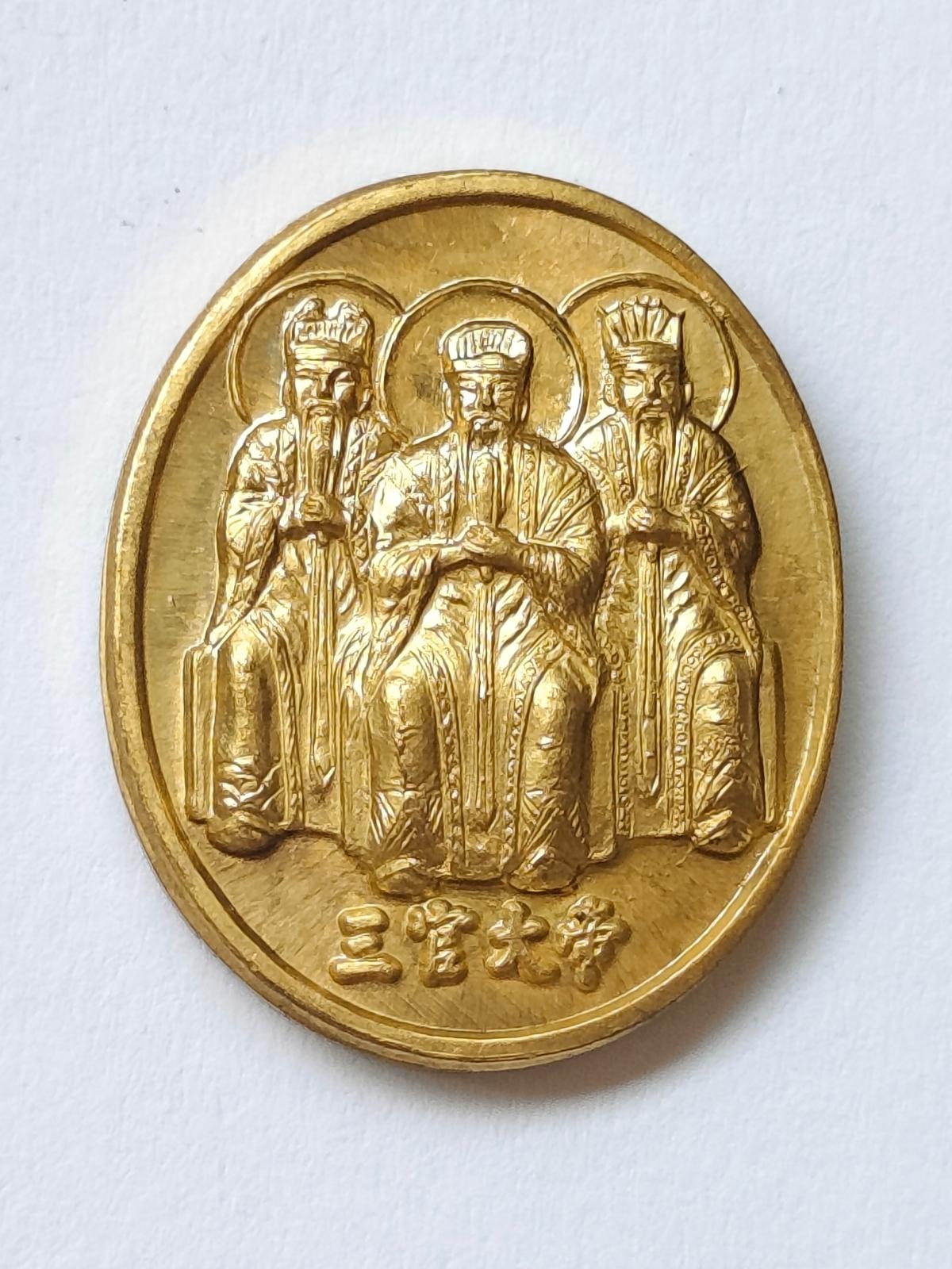 เหรียญ三官大帝 ซันกวนต้าตี้ 3 จักรพรรดิ์์แห่งสวรรค์ ดิน และน้ำ ผู้ปกครอง3ภพ มีอำนาจประทานพร ประทานโชคลาภ ประทานอภัย ปกโปรด3ภพ เนื้อทองฝาบาตร(ทองเหลือง)