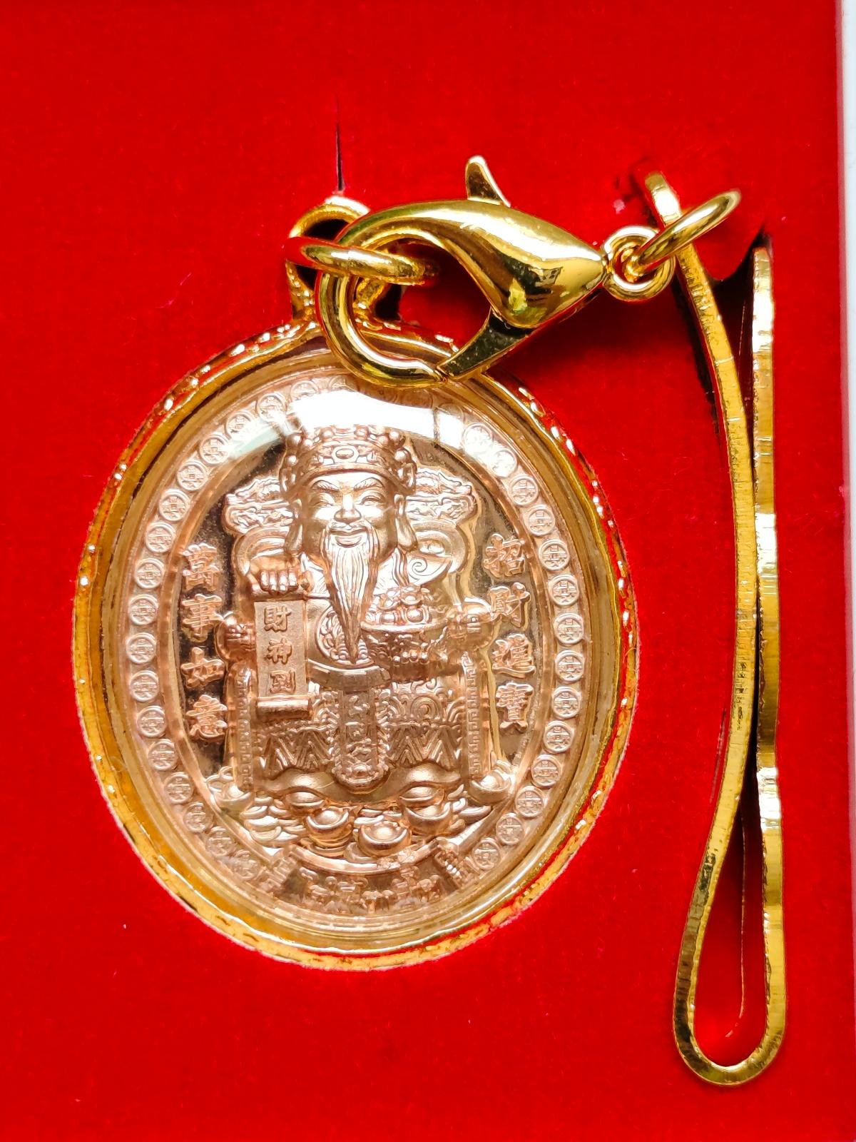 เหรียญเทพเจ้าแห่งโชคลาภ ไฉ่ซิ้งเอี๊ย อ้วนท้วนสมบูรณ์พูนสุข ถือก้อนทองมหาขุมทรัพย์ เทพเจ้าโชคลาภมาถึง สมปรารถนาทุกประการ เงินทองเพิ่มพูน ล้อมรอบเหรียญเงินจีน อวยพรแคล้วคลาดปลอดภัย