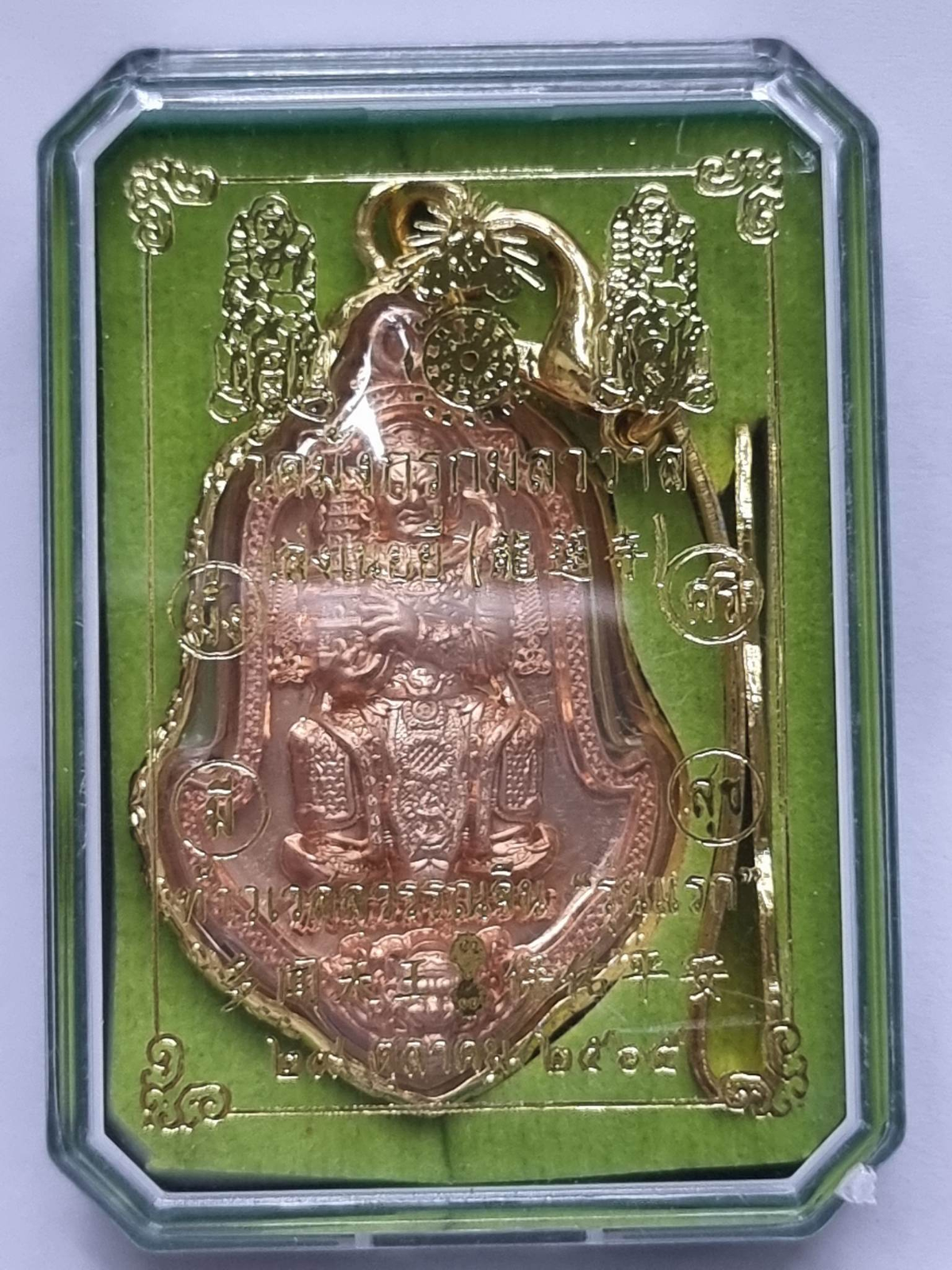 ด้านหลัง เป็นรูปวัชระทิเบต 4 ปลาย แสดงถึงปัญญาสูงสุด และขจัดอุปสรรคทั้งปวง และยันต์ดอกบัวภายในประดิษฐานหัวใจพระคาถาองค์ท้าวเวสสุวรรณ