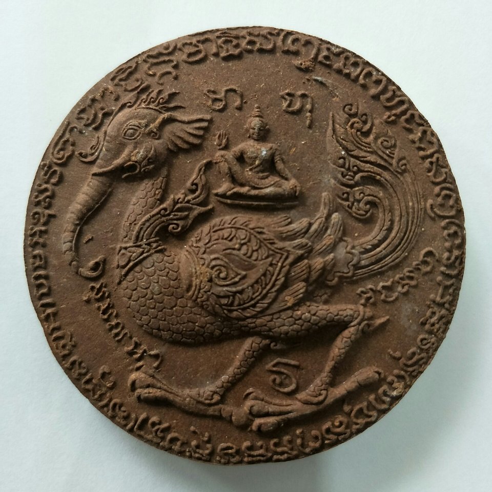 เป็นอันว่าได้ทั้งหาทรัพย์และคุ้มทรัพย์ ด้านหลังเป็นนกสาลิกาป้อนเหยื่อ นกเป็นสัตว์ที่หากินเก่งขยัน ตื่นหากินแต่เช้า จะกลับรังก็มืดค่ำ พร้อมทั้ง “ยันต์สำเภาทอง” ยันต์ประจำตัวของหลวงปู่เมฆ สจฺจาสโภ จึงเป็นอนุสติเตือนใจให้ผู้ที่วัตถุมงคลนี้ให้รู้จักสร้างฐานะ เหมือนเรือสำเภาที่ออกไปค้าขาย ล้อมรอบหน้าหลังด้วยพระคาถาบารมี 30 ฑัต