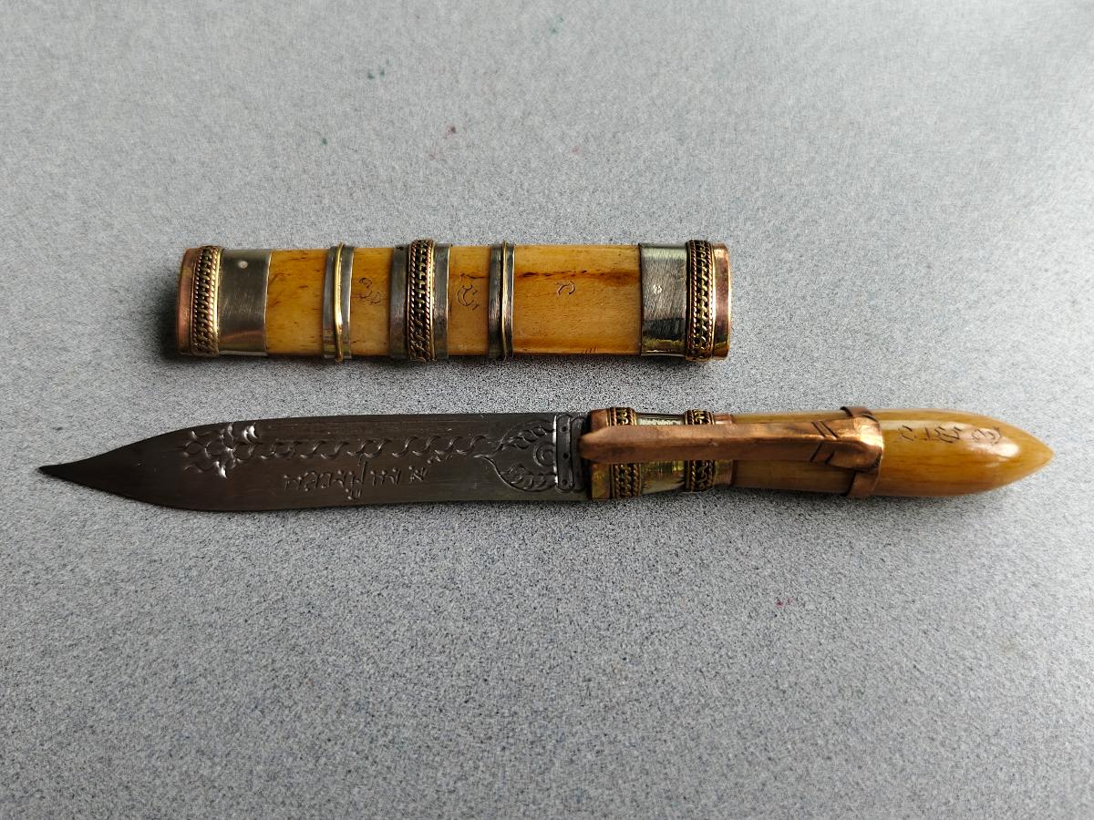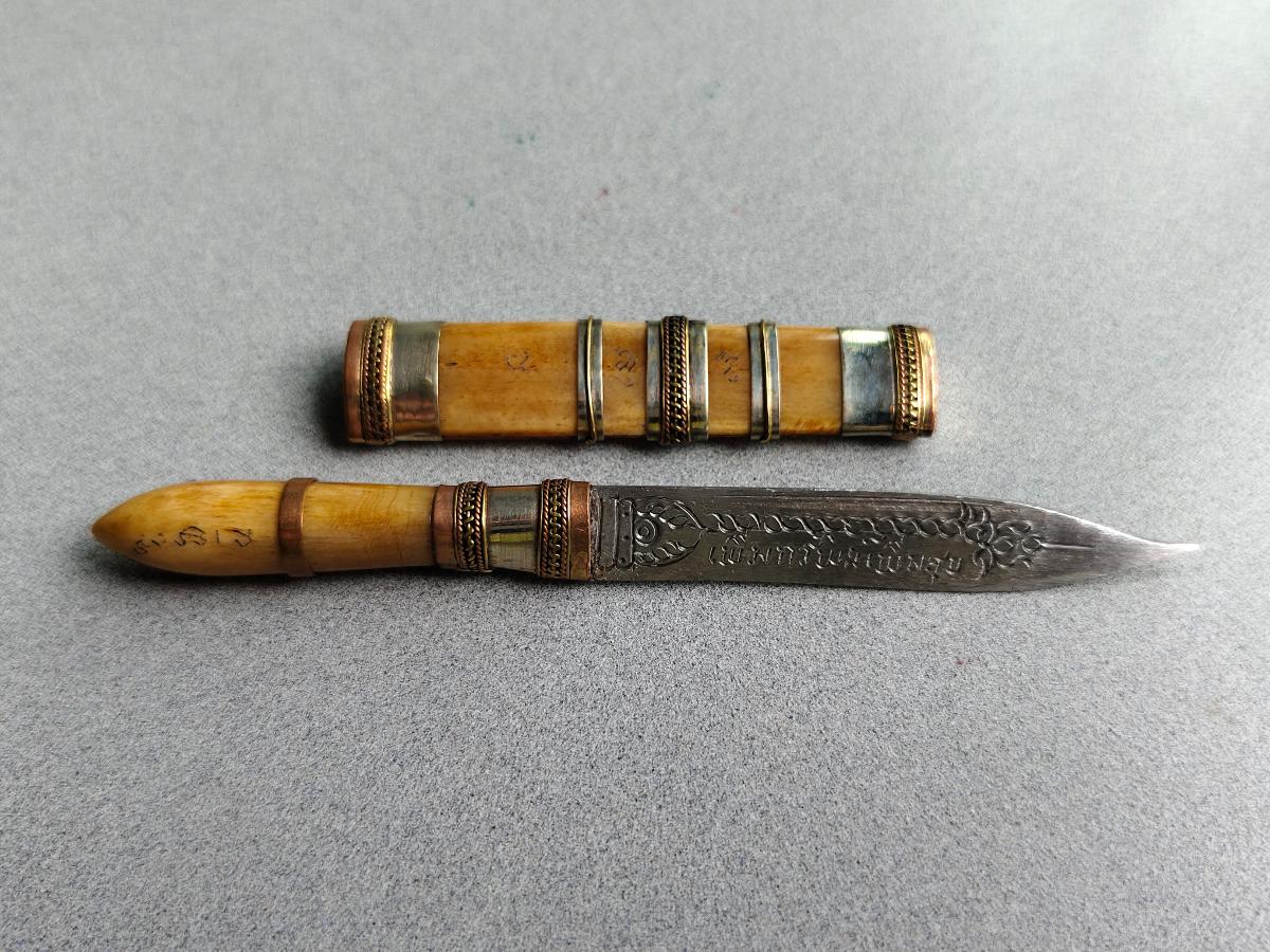 มีดหมอ ปราบมาร หลวงปู่หงษ์ พรหมปัญโญ วัดเพชรบุรี รุ่นเพิ่มทรัพย์เพิ่มสุข ปี 2553 ขนาดยาว 5 นิ้ว ด้ามและฝักมีดทำจากกระดูก รัดด้วยทองแดงศิลปะโบราณนครสวรรค์