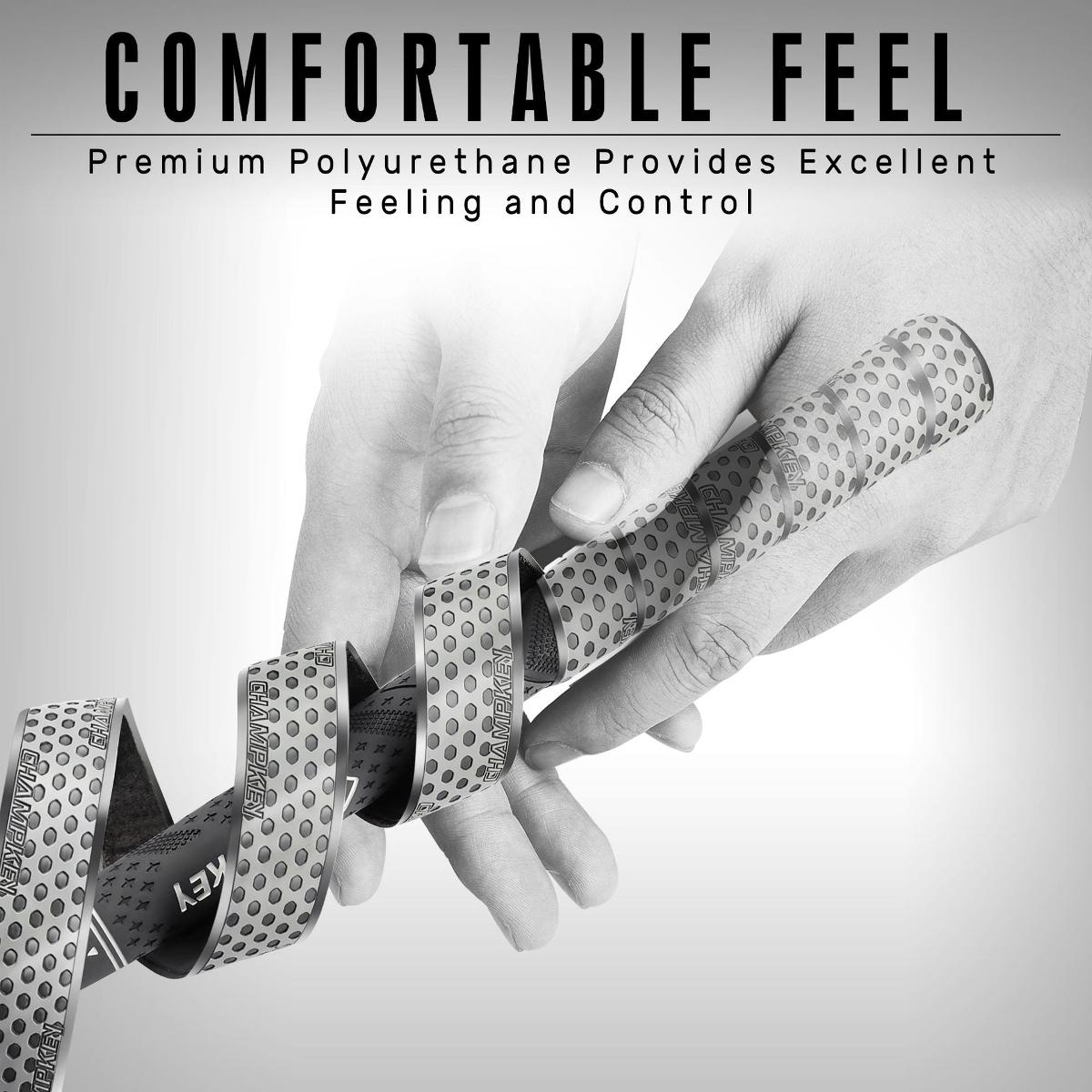 GRIP CHAMPKEY วัสดุยางนุ่มที่ตอบสนองเป็นอย่างดี ทำให้รู้สึกดีขึ้นและดูดซับแรงกระแทกบรรเทาอาการเมื่อยล้าของมือ พื้นผิวแบบโมเดอเรต การออกแบบทางวิทยาศาสตร์ พร้อมเครื่องหมายบนพื้นผิวที่สร้างขึ้นเพื่อดึงความชื้นออกจากพื้นผิว เพื่อให้สามารถยึดเกาะได้อย่างสม่ำเ