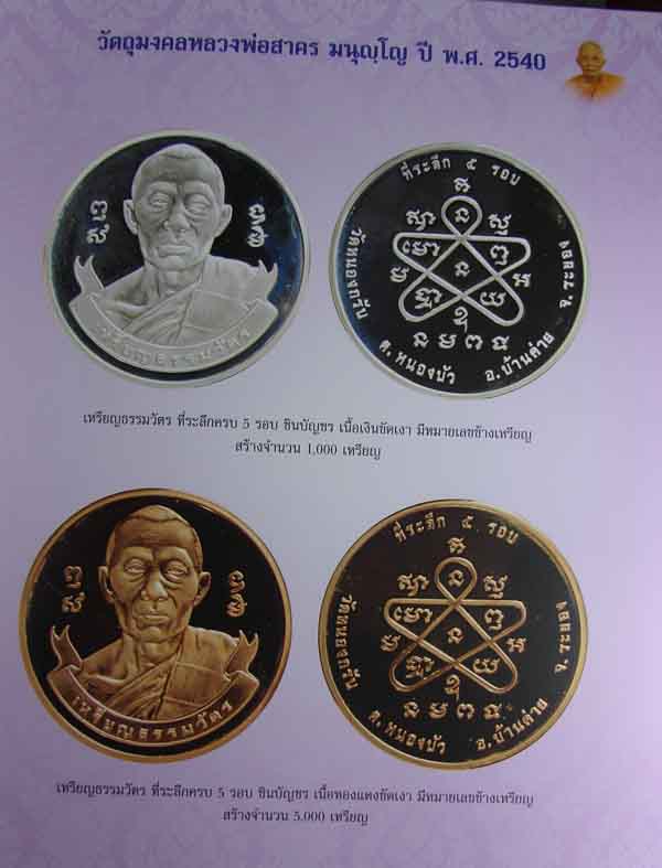 เหรีญธรรมวัตร 5 รอบ ชินบัญชร หลวงพ่อสาคร มนุญโญ วัดหนองกรับ ต.หนองบัว อ.บ้านค่าย จ.ระยอง เนื้อทองแดงนอกขัดเงา มีหมายเลขขอบเหรียญ สร้าง 5,000 เหรียญ พ.ศ. 2540