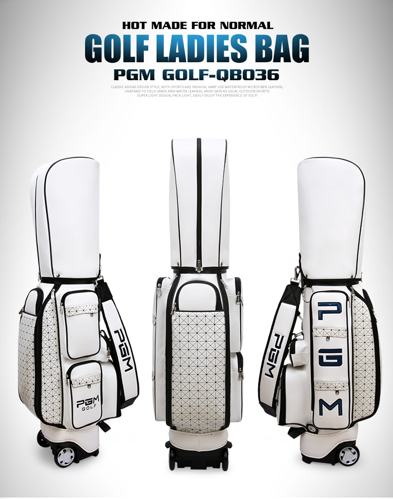 PGM QB036 TROLLY STAFF GOLF BAG PU 100% วัสดุคุณภาพเเข็งเเรง เป็นถุงกอล์ฟคุณภาพสูง เกรดระดับพรีเมี่ยม พร้อมล้อลากเลื่อน ในตัว พกพาสะดวกสบาย มาพร้อมมือจับคันชักคู่ทำจากอะลูมิเนียมคุณภาพดี สามารถลากเลื่อน ไม่ตกยกให้หนัก พร้อมหูหิ้วเหมาะมือ ช่องใส่ไม้กลอ์ฟ