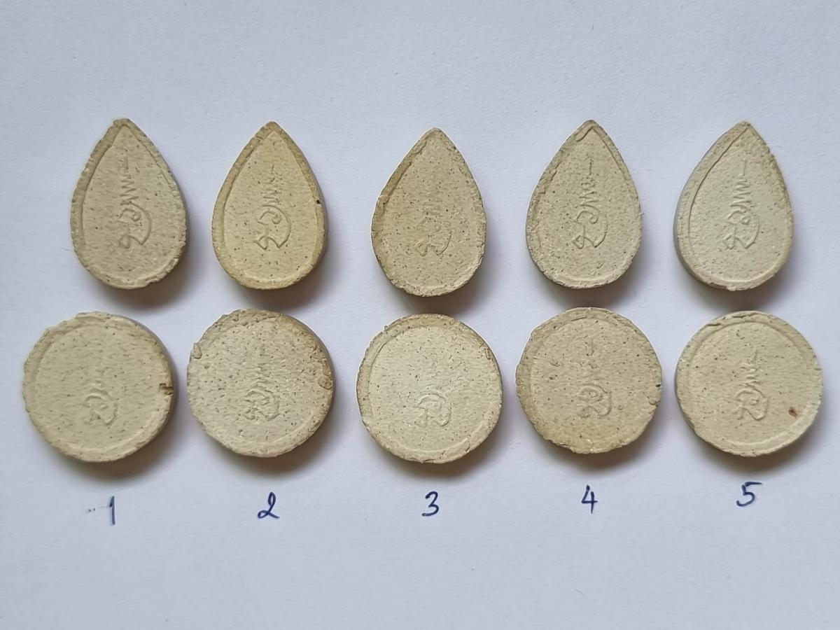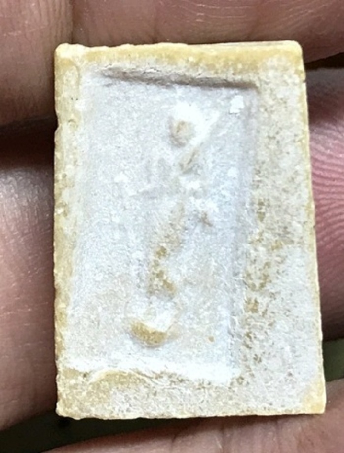 พระผงหลวงพ่ออุตมะ วัดวังก์วิเวการาม กาญจนบุรี รุ่นผงอิทธิเจไตรมาส พิมพ์เม็ดกระดุม ปี 2524